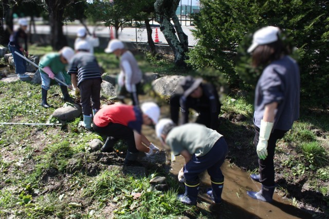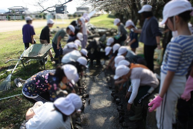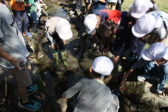 活動は、わさび田に湧き水を引く「せせらぎ」の掃除から始まりました。児童たちはみんなで協力し、泥や落ち葉を取り除き、水の通り道をきれいにしました。その後、山口さんが持ってきてくださったドジョウを放流。澄んだ水の中を元気に泳ぎ回る姿を、みんなで追いかけ、興味深く観察しました。