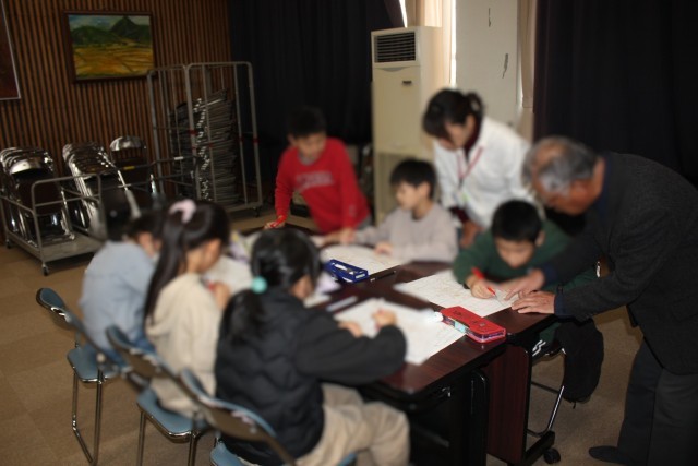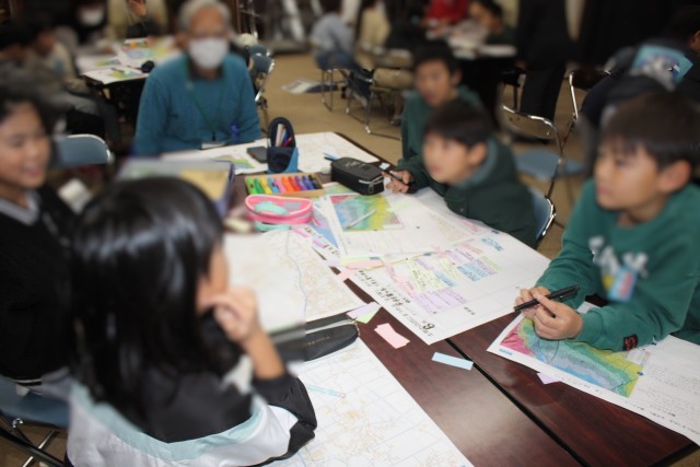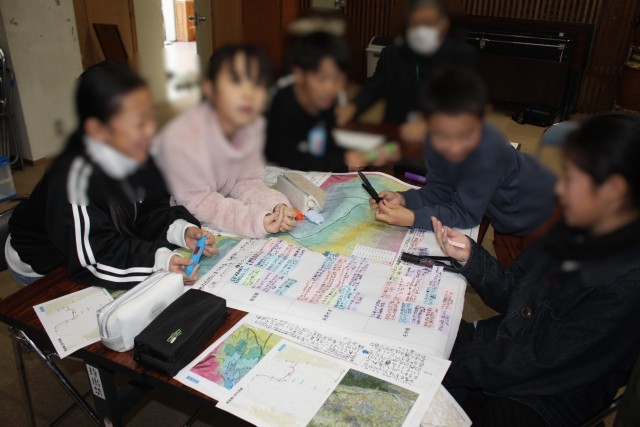 4年1組では、「ふるさと学習」として安曇野の人や自然について学んでいます。11月11日(火)、安曇野ふるさとづくり応援団の協力を得て「謎探しウォーク」を企画し、学校周辺のフィールドワークを計画しました。今回はその一環として、地域の講師の先生方による「等高線」を題材にしたワークショップが開かれました。子どもたちは、グループごとに色分けされた地図を見比べながら、熱心に等高線を探しました。すると、「矢原堰」が等高線に沿って、かつ標高が低い方に向かって流れていることに、子どもたち自身が気づきました。この発見から「なぜだろう?」と、それぞれが新たな疑問を持ち、次回のフィールドワークで確かめる予定です。今回は、この学習に興味を持ったボランティアさんも授業に参加。地域ぐるみで学ぶ、新たな「安曇野の時間」が展開されています。