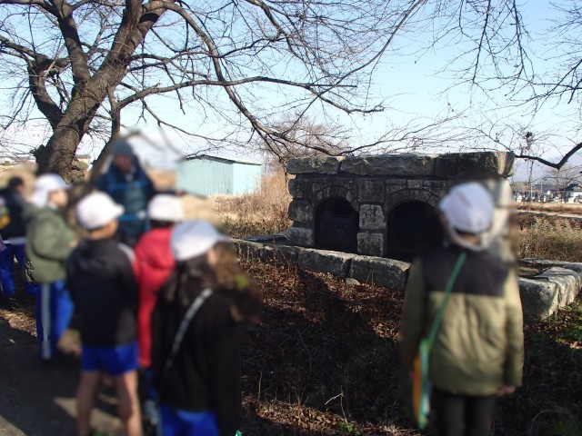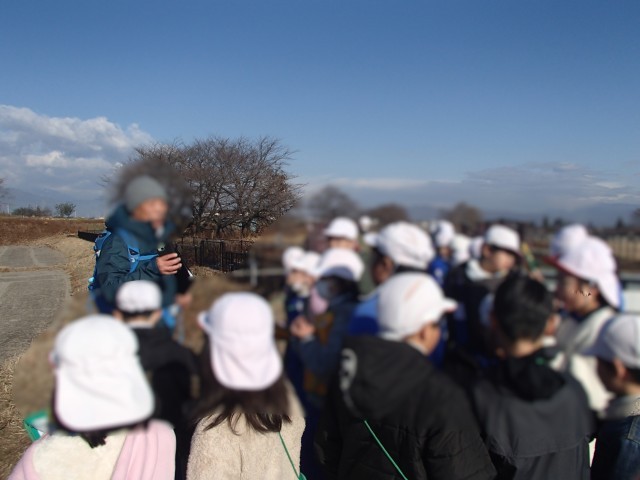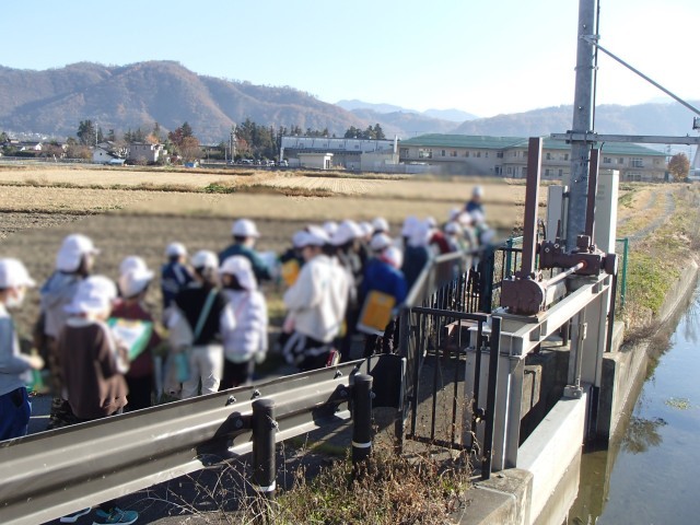 1126日(水)、43組は総合的な学習の時間に、堀金文書館の千村先生を講師にお招きし、矢原堰(やばらせぎ)の歴史を学ぶフィールドワークを行いました。児童たちは堰沿いを歩き、その歴史と役割について学習を深めました。フィールドワークでは、矢原堰沿いの道が、かつては重要な街道として使われていたことを知りました。沿道には馬頭観音や道祖神が残されており、当時の人々の信仰や生活の様子をうかがい知ることができました。また、堰の取水口が犀川(さいがわ)にあることや、そこにある記念碑が、この堰が地域にとってどれほど大切にされてきたかを物語っていることも学びました。特に、万水川(よろずいがわ)と交差する地点には、昔、「めがね橋」と呼ばれた美しい通水橋があったという話に、児童たちは興味津々でした。たくさん歩いて学習した児童たちは、学校に戻った後、給食をもりもりと食べ、充実した一日の締めくくりとなりました。