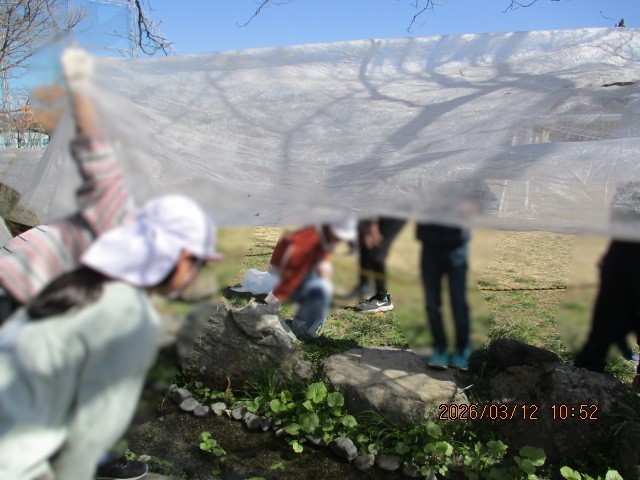 3月12日(木)、3年3組では1年間の総合的な学習の締めくくりとして、万水の山口さんをお招きしました。前半は活動のまとめとして、自分たちが作成したポスターやパンフレットを使って発表を行いました。山口さんからは「掃除やわさびを大切にする気持ちが伝わった。3年生でこれほど完成度の高いものが作れるなんて」と、温かい称賛の言葉をいただきました。その後、せせらぎの寒冷紗を外す作業も一緒に行いました。後半は、山口さんの提案で「わさびとお菓子の食べ合わせ実験」に挑戦!本物のわさびをすりおろし、ポッキーやマシュマロなど意外な組み合わせを試食しました。「チョコと合う!」「辛いけどおいしい!」と、教室は大盛り上がり。商品開発の苦労についても伺い、自分たちで新しい美味しさを見つける楽しさを学ぶ、貴重なまとめの時間となりました。