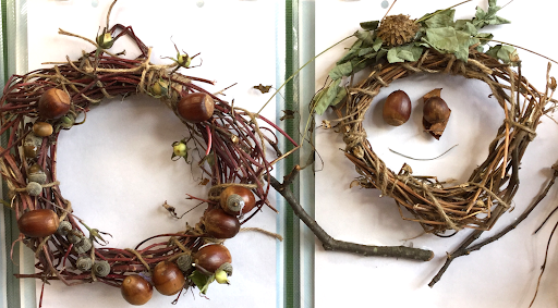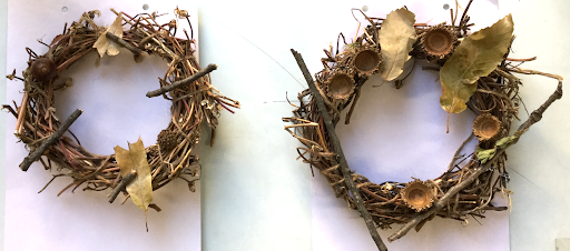 生活科で一学期から育て始めたあさがおの学習も、いよいよまとめの時期に入ってきました。夏にきれいな花を咲かせて楽しませてくれたあさがおから、たくさんの種を収穫し、残ったつるを巻いてリースにしました。つるの根元を切る前には、「あさがおさん、今までありがとう。」とか、「おしゃれなリースに生まれ変わってね。」など、それぞれに優しく声を掛けながら作り始める姿がありました。先週の遠足で拾ってきた「秋」を貼り付けてリースを飾り、オリジナルリースが仕上がってきています。持ち帰ったどんぐりの処理などにご協力いただき、ありがとうございました。身の回りの自然と関わり合いながら、体験を通して学んでいく生活科の時間を、これからも大切に取り入れていきたいと思います。