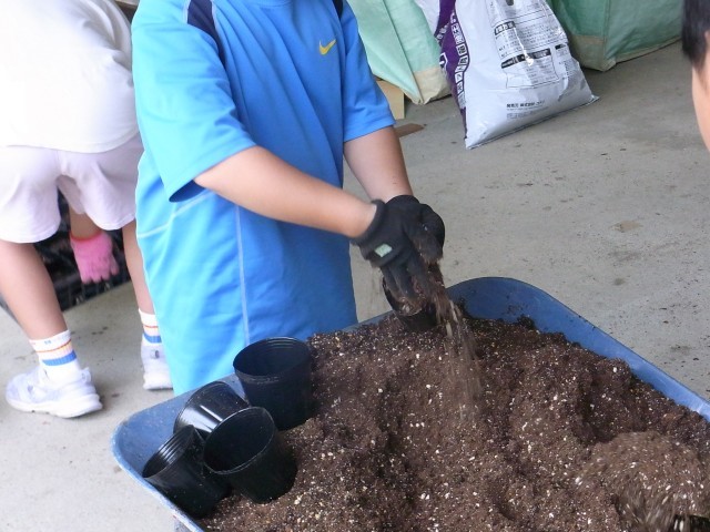 「なんだか少し 手つきが違う」~2年生ポット土入れ~