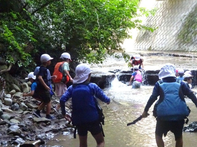 1・2年生が、学区内にある濁沢川へ川遊びに出かけました。ライフジャケットを着て深さや浮かぶことを楽しむ「たんけんコース」、生き物を探すことを楽しむ「じゃぶじゃぶコース」に分かれて、自分たちの地域にある川で思いっきり遊ぶことができました。