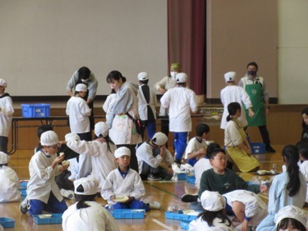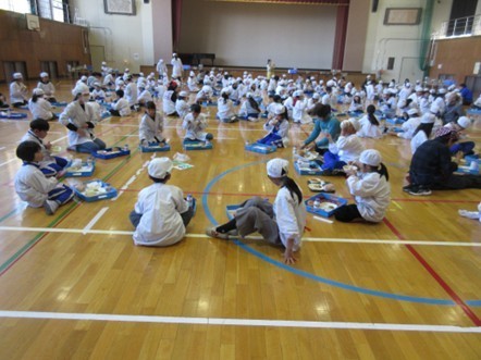 全校が縦割り班になり、いつもと違うメンバーで体育館で給食を食べました。学年を超えたおしゃべりが弾み、楽しさで食欲がアップ!自然と笑顔が生まれ、いつもよりおいしく感じる給食の時間となりました。なかよし給食を通して、学校全体がさらになかよくなりました。
