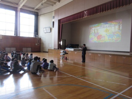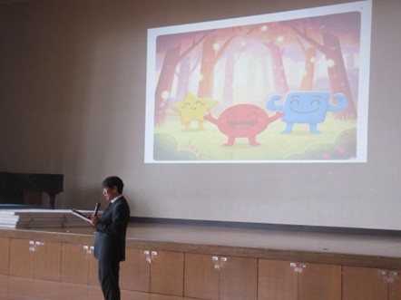 自作の絵本を使っての校長講話。なかよし月間にちなんで、「個性を大切に支え合う」がテーマでした。私たち1人ひとり、見た目も得意なことも違います。でも、違うからこそお互いに助け合うことができます。個性を大切にし、支え合える学校を、みんなでつくっていきましょう。