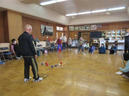 アルプス区の方11名と、学校の視聴覚室でボッチャ交流会を行いました。普段は公民館で行う活動ですが、今回は子どもたちとの交流として実施。ルールを教わり、一緒のチームや対戦チームとして、約1時間たっぷり交流を楽しみました。参加した子どもたちからは「またやりたい」との声が聞かれ、世代を超えた楽しいひと時となりました。