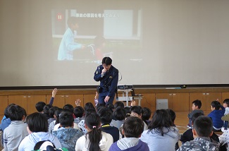 新学期が始まって間もないこの時期に,交通安全教室を行いました。今回は,豊科交番の所長さんに来ていただいて,DVDを使ったクイズを交えて交通安全についてのお話をうかがいました。