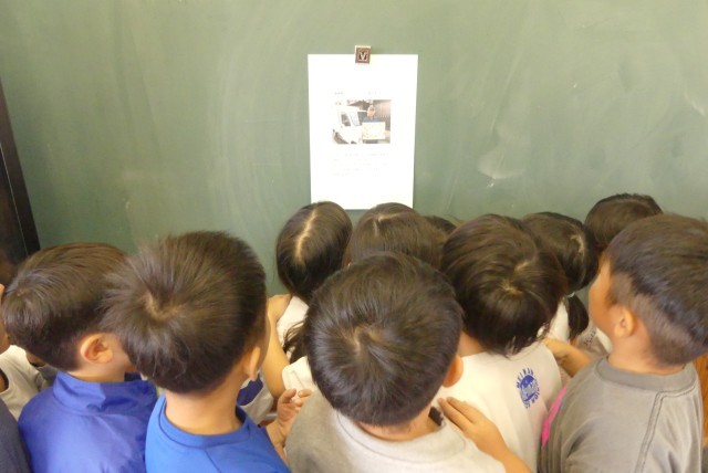 児童たち(写真は1年生)は、お知らせをみんなで囲み、メッセージが無事に届いたことを喜び、嬉しそうに見ていました。