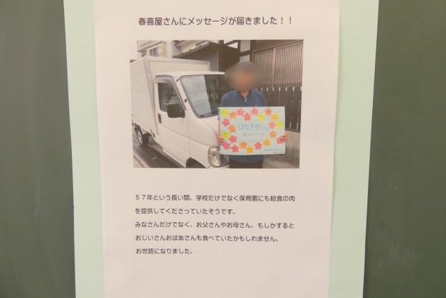 学校給食でお世話になっていた「春喜屋」さんにお贈りしたメッセージが、お手元に届いたとのお知らせをいただきました。