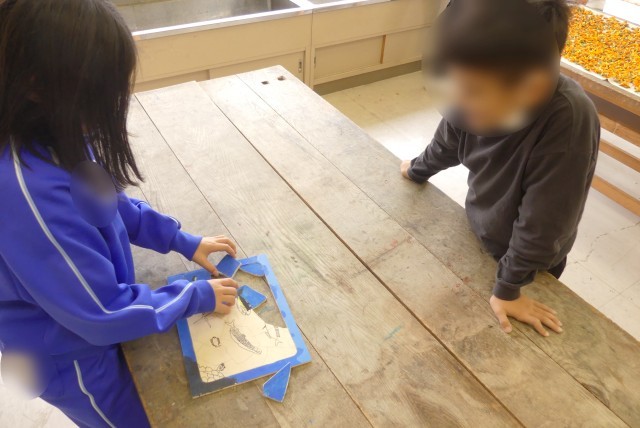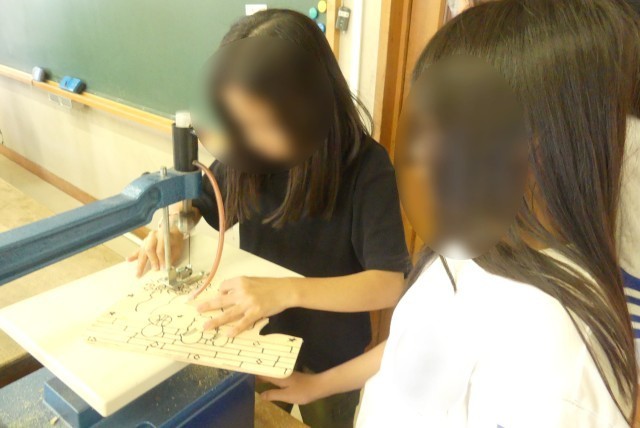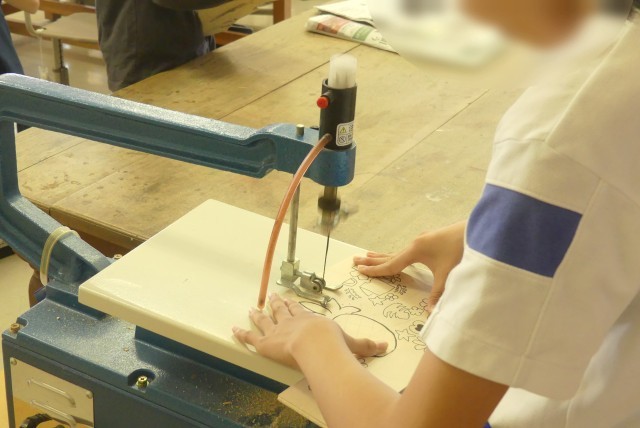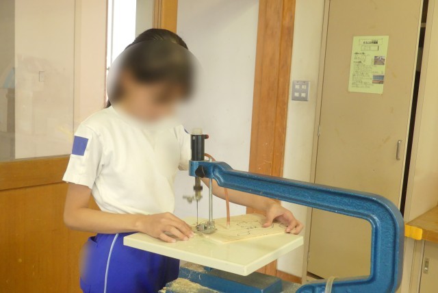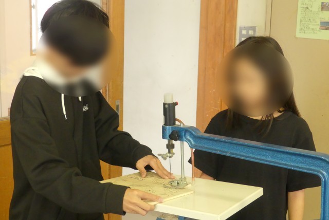 今日は図工室で、糸のこを使ってパズルをピースごとに切り分ける作業をしていました。