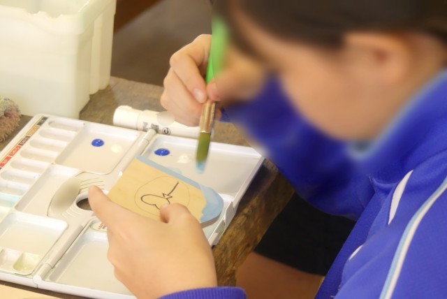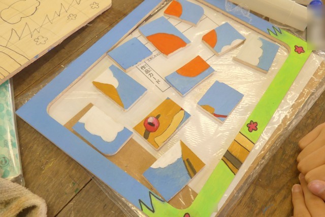 1ピースずつ順番に糸のこを使って切り分け、そこに絵の具で色をつけていました。