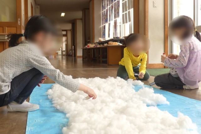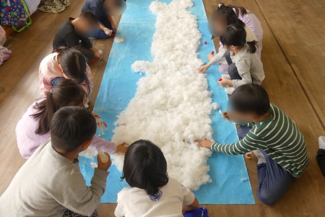 子どもたちからの「つくりたい!」という声に応え、担任の先生が模造紙をつなげた大きな紙と綿を用意してくれたのです。