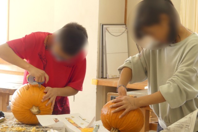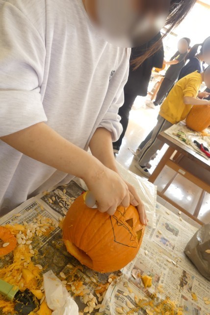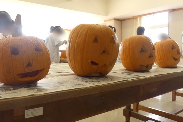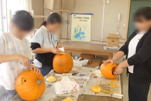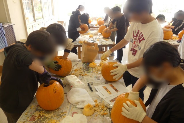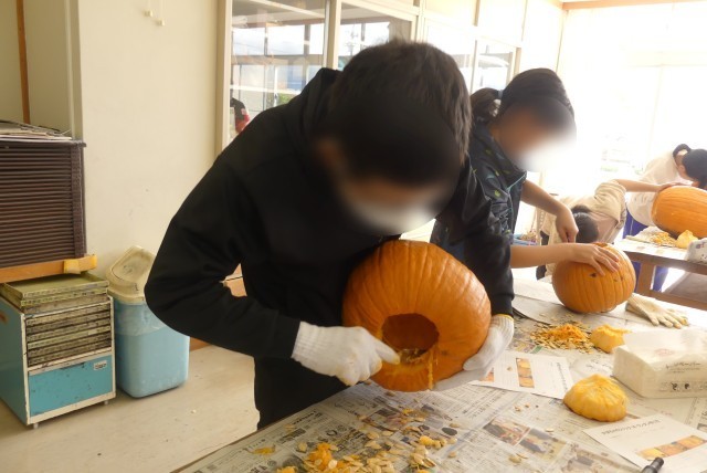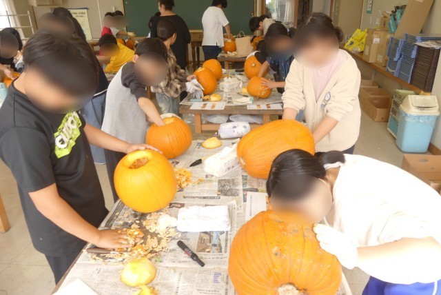 作業をしていた図工室には、かぼちゃの匂いが充満し、種やわたがあちこちに。