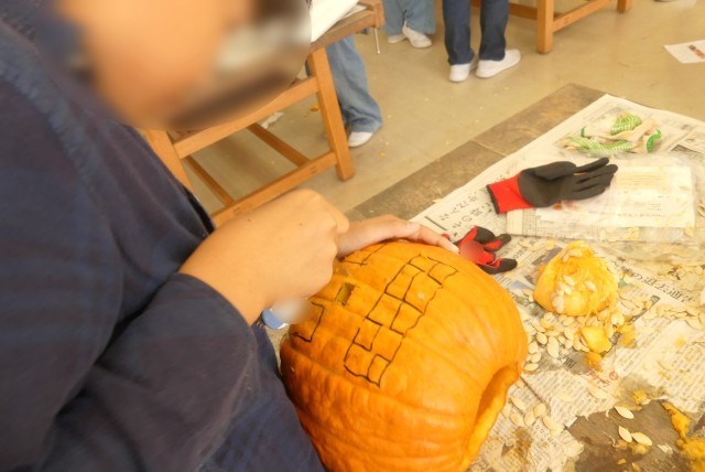 その後、マジックでおばけかぼちゃの顔をデザイン~目や口をくりぬくのは、楽しい作業。