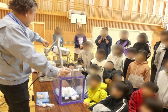 今日は、佐久市に本社を置く樫山工業さんにお越しいただき、5・6年生に真空実験の授業をしていただきました。