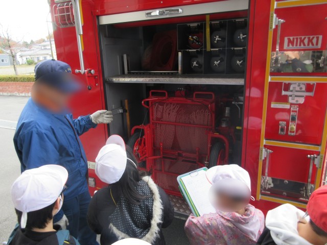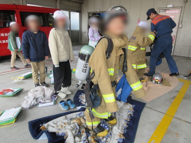 消防士さんの防火服を着せていただいたり、出動時のデモンストレーションを見せてもらったり、貴重な経験をたくさんさせていただきました。
