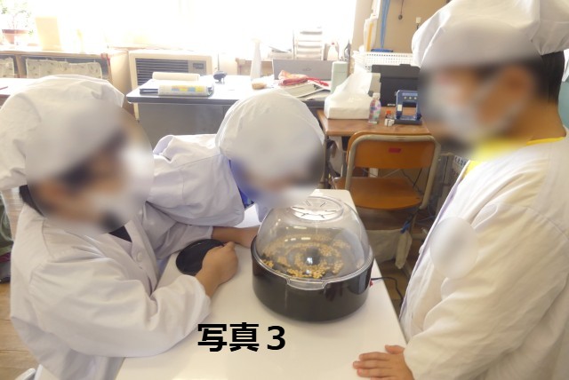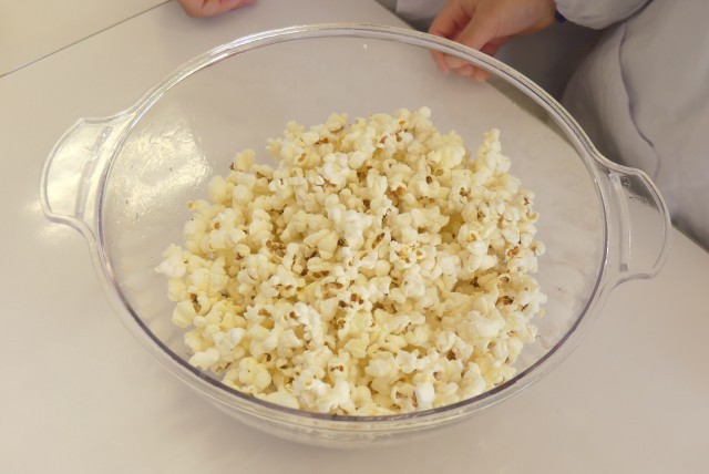 みんなで作って収穫したポップコーンの種が、熱を加えるとどんどんはじけ、いい香りがしてくる様子をじっくり観察していました。