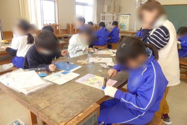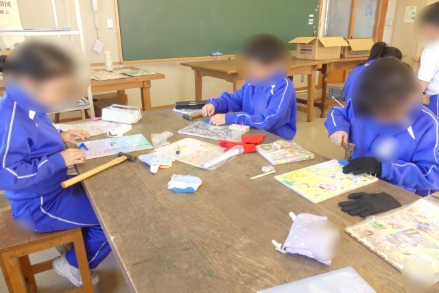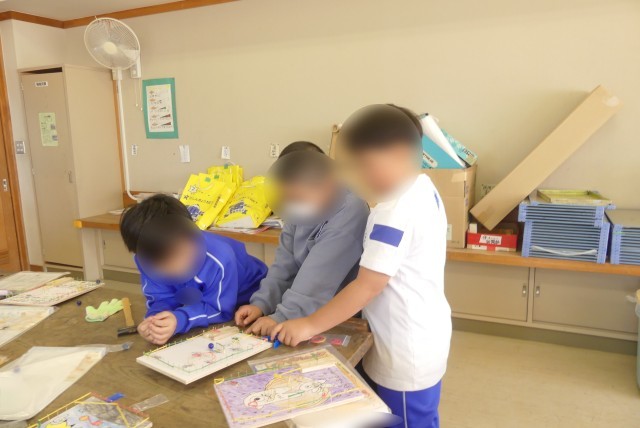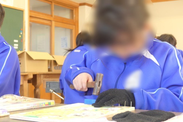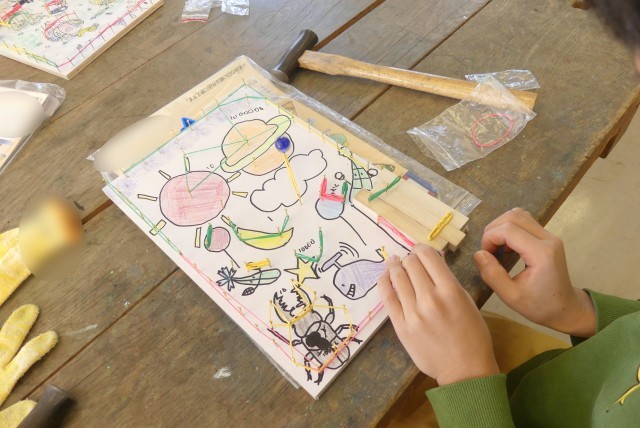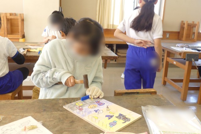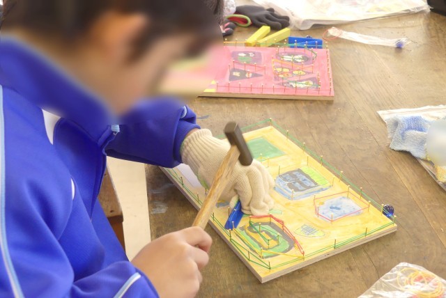 3年生が図工で、釘を使ってゲームを作っています。