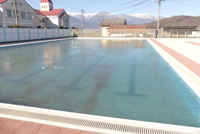 一晩でプールに3㎝ほどの氷が張ったため、庁務員の先生が氷を割る作業をしてくれました。