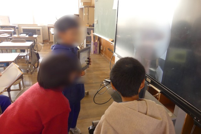 子どもたちは、事前に作成したタブレットの資料を使って、地元の名所などを紹介。
