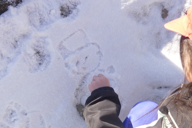 思い思いに雪の感触を楽しんでいると、2年生の子が動物の足跡を見つけました。