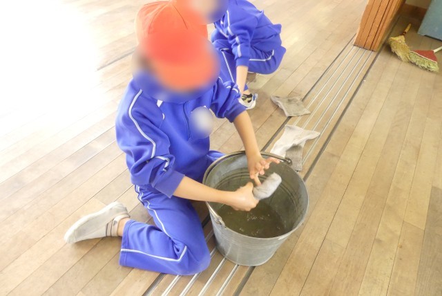 5月には雑巾の絞り方からお掃除の練習をしていた1年生。