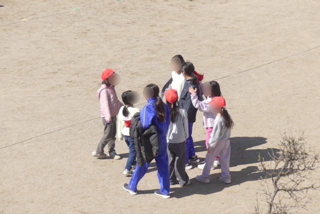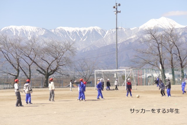 校庭で元気いっぱいに遊ぶ子どもたちと、その先にそびえる雄大な山々との対比が、素晴らしく美しいです。