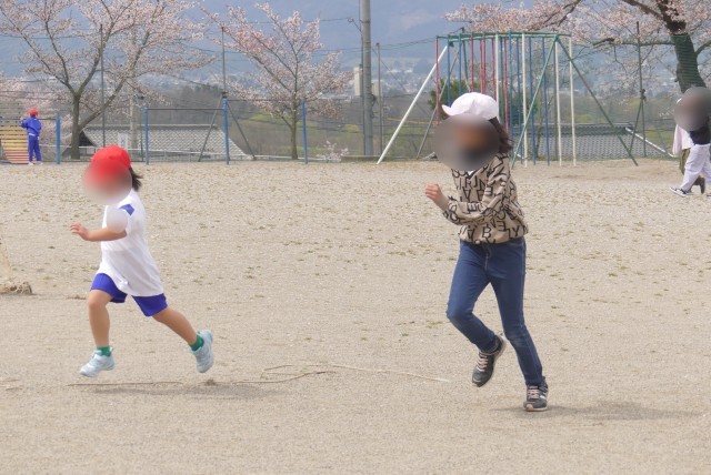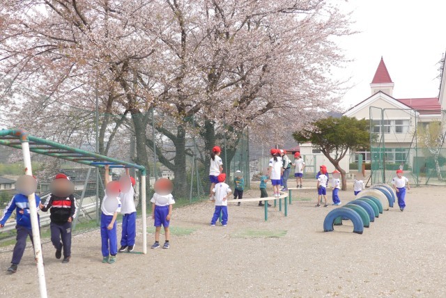 昨日の2時間目休み、桜の花が舞い散る中で元気に遊ぶ子どもたちの様子を写真に収めました。