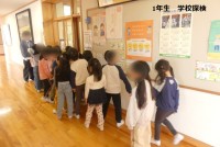 4月10日(金) 雨2時間目、職員室にいると廊下から可愛らしい声が聞こえてきました。外に出てみると、1年生が「学校探検」の真っ最中!廊下から窓越しに職員素を覗いて手を振る1年生たちに、校長先生や教頭先...