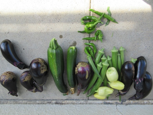 お陰様で、順調に育っている農園の野菜です。水不足もあってか、ナスの表面が変色し、固くなることもありますが、たくさんの野菜が収穫できております。近くに来られた際は、地域の方にお立ち寄りいただければ、その時のものをお渡ししたいと思っております。