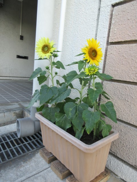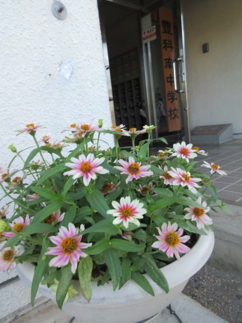 新学期開始を前に、職員玄関に花が飾られました。向日葵と百日草です。