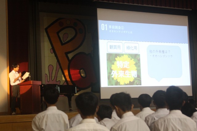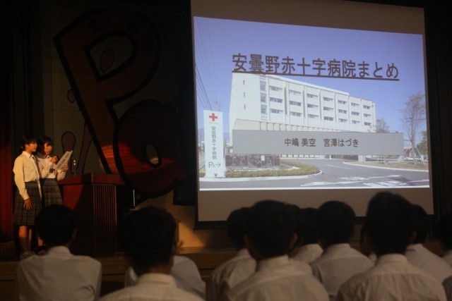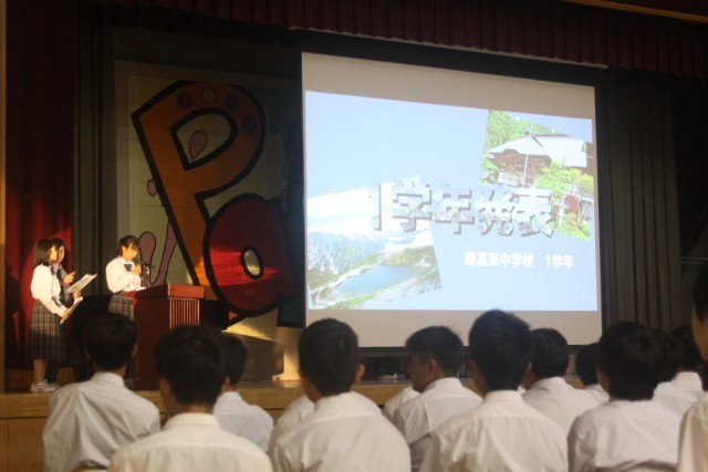 1学年は「安曇野ウォーク」と「白馬八方池トレッキング」、2学年は「職場体験学習」における学びの成果を発表しました。スライドを活用しながら、劇を取り入れたり、アニメをパロディ化したりしながらアイディア凝らした発表です。