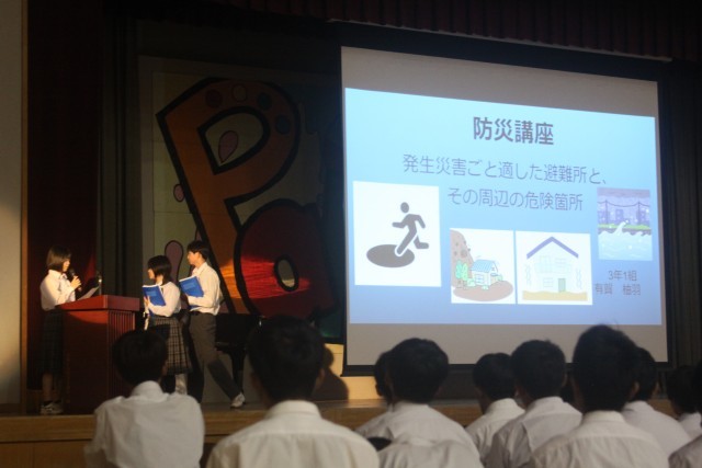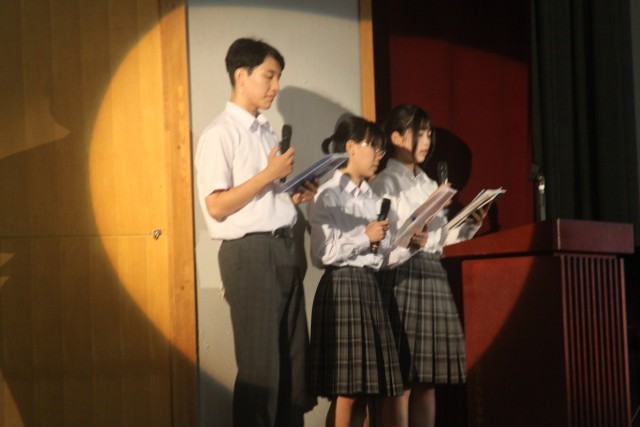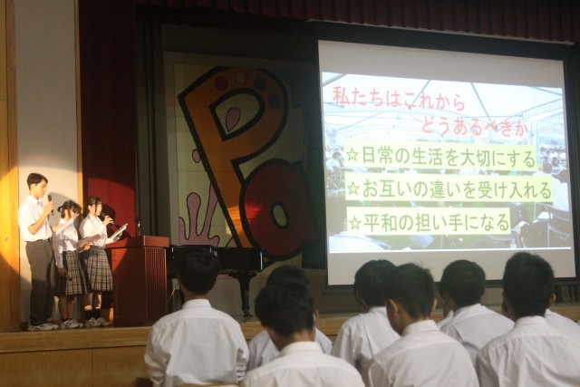 その後、広島平和記念式典に参加した3年生3名による報告が行われました。今を生きる自分たちがこれからどうあるべきか、想い巡らせ学びを深めた姿がありました。