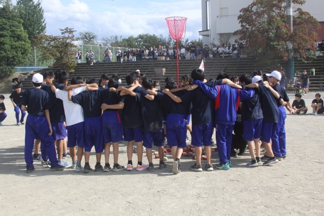 グランドのあちらこちらで、各クラスが円陣を組み気合いを入れます。