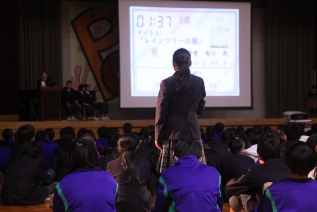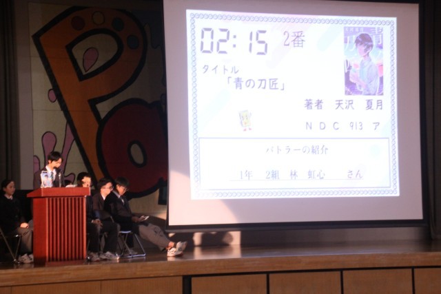 バトラーの手元に読み原稿はなく、ステージ上から全校生徒の顔を見て、自分の言葉でお薦め本の魅力を堂々と発信します。