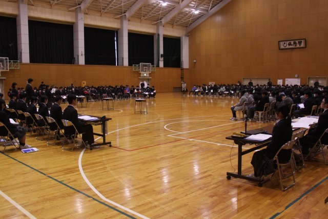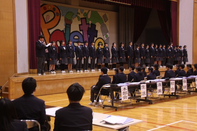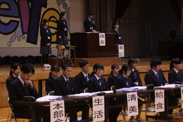 整然とした入場から始まり、生徒会役員の堂々とした発表と受け答え、全校生徒の総会へ臨む姿、活発な質疑応答と、引き締まった良い生徒総会でした。