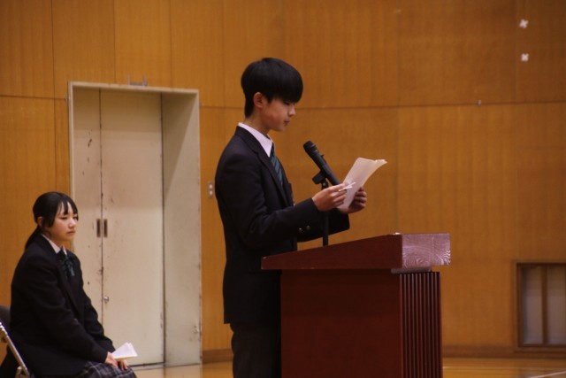 始業式では、各学年代表生徒が、新年の抱負と決意を全校生徒の前で堂々と発表しました。