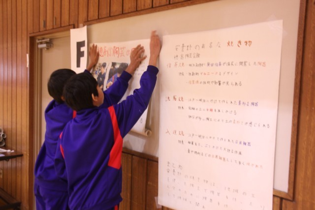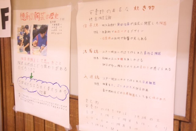 会場となった体育館を6つのブースに分け、計35グループ、参加生徒全員が発表に挑戦しました。安曇野の自然、わさび、穂高の陶芸、ガラス工芸、沈金の歴史・・・と、探究した内容は様々。