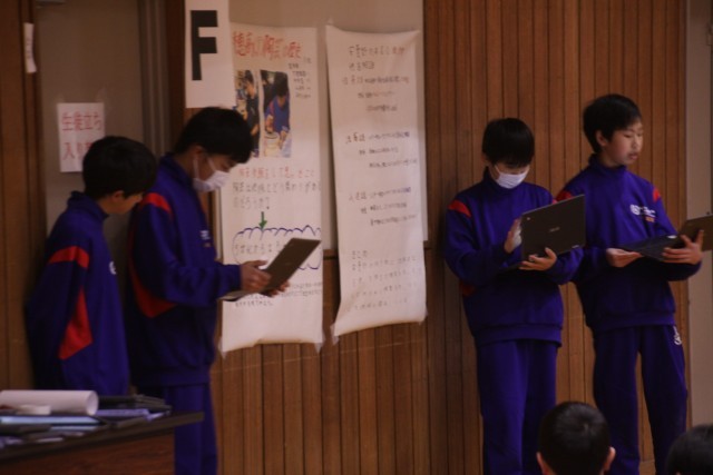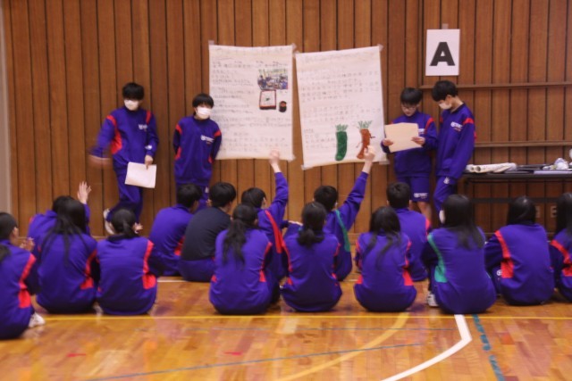 見やすくまとめた模造紙をもとに、聴く人とのコミュニケーションを意識し、制限時間をオーバーさせずにかつ時間が余りすぎないよう、各グループが工夫を凝らした発表を行いました。
