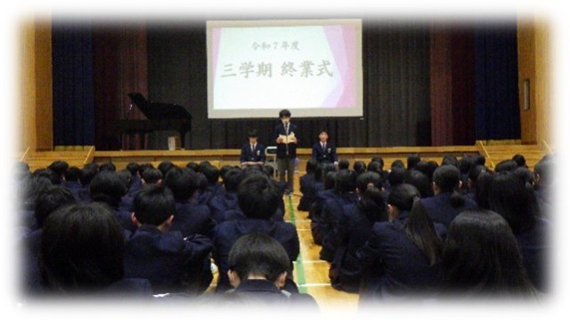 終業式で作文発表した生徒からは、「部活動を通して、できることはさらに伸ばし、うまくいかなかったことは練習してできるようにこれからもしていきたい」「テスト勉強を頑張ったが、思うような結果にはつながらなかった。しかし、こうして地道に学習していくことが3年生になったときにいきていく大事なことだと思う」「豊かに生きることをテーマに、これからも考え続けていきたい」という発表がされました。学校長からは、令和8年度創立75周年を迎えるにあたり、2021年度から三郷中学校での出来事についての話がありました。そして、「豊かに生きる人となるを求めていってほしい」とメッセージが贈られました。