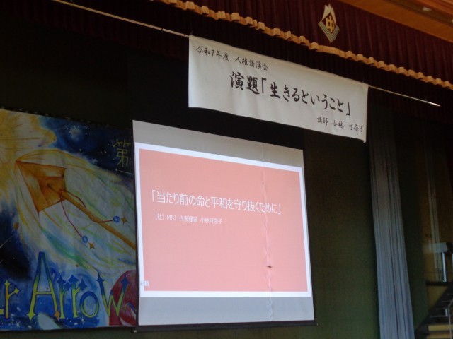 10月23日(木)の5校時に人権講演会がありました。講師に小林可奈子さんをお招きし、「生きるということ」という演題に講演をしていいただきました。ご自身の娘さんの闘病生活のお話や人生の中で感謝すること、好きなことに全力を振り切ることなどの大切さを伝えていただきました。小林さんの講演をお聞きして、生徒たちは「自分が好きだと思ったことに全力で取り組みたい」「出会えた人やものに感謝したい」「生きていられるというのは当たり前ではなく、素晴らしいことなんだと分かった」など感想をもちました。小林さんから教えていただいたことを忘れずに、これからの学校生活にいかしていきましょう。