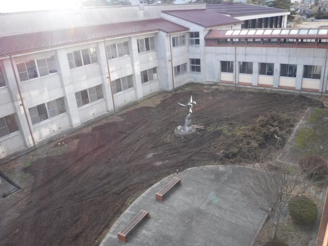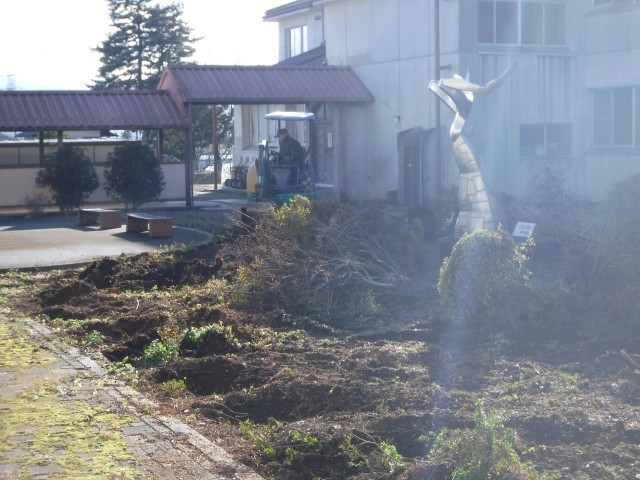 12月12日(金)の午前中、来年度の80周年記念事業の1つである中庭の芝生化に向けた準備として、中庭の植樹の整備作業を行いました。庁務員さんが重機を使ってさつきなどの樹木を除去し、夏場はきれいな花が咲いていた花壇もきれいに整地されました。来年度は、この中庭が芝生広場になるようです。中庭には中嶋大道さんのステンレス像の「脱皮」という作品がありますが、来年度、まさに新しい中庭に脱皮することになります。今からとても楽しみです。
