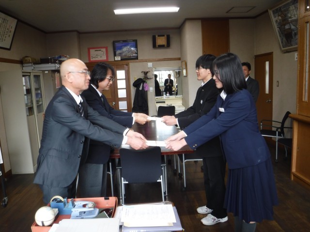 2月16日(月)の昼休みに、安曇野市商工会の皆様が図書券を寄付するために来校してくださいました。安曇野市商工会堀金支部工業部会様と一般社団法人松本法人会堀金部会様よりいただいた図書券を、生徒会副会長の2人に寄贈していただきました。昨年度寄付していただいた図書券で購入した本を紹介し、今年度もこれからどんな本を買わせていただこうかと楽しみになりました。商工会の皆様、松本法人会の皆様、本当にありがとうございました。
