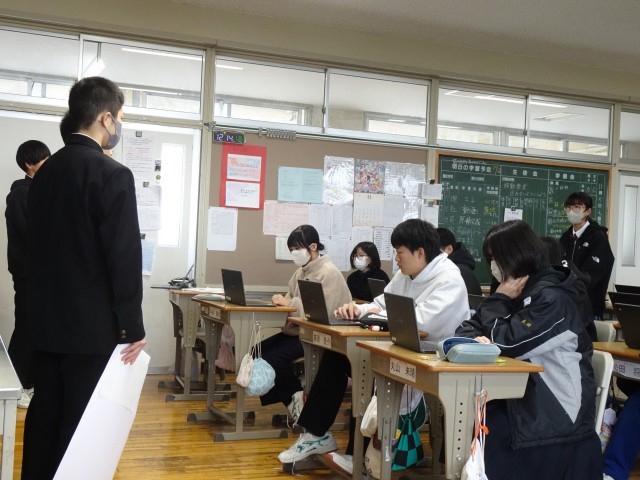 11月19日(水)の令和8年度生徒会役員選挙立会演説会に向けて、11月5日(水)~11日(火)までの期間、2年生の会長候補・副会長候補の生徒と推薦責任者が1,3年生の各教室を訪問し、どんな生徒会を目指していきたいのか、そのための具体的な活動内容について演説しています。候補者の演説に対して、しっかり話を聴き、積極的に質問や意見を出す姿が多く見られます。