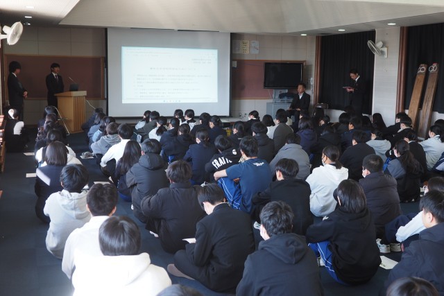 3月11日(水)1校時に「豊科北中学校同窓会入会式」が行われ、同窓会長の堀金 寛郁様から、「豊科北中学校同窓生として誇りをもってこれからの人生を歩んでいってほしい」という激励のお言葉と同窓会についてお話をしていただきました。卒業生は、41期同窓生となります。