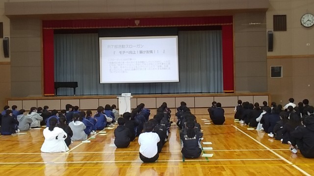 7日(月)に2,3年生の部活動発足会が行われました。令和7年度の部活動スローガンは、部長会が考案した「モチベ向上!築け友情!」です。臼井宏之校長から「部活動は人としての成長に欠かせない多くのことを学ぶことができる。そのために日々の部活動に取り組み、部活動を通して自分の人間性を高めている。一人ひとりが、そして各集団が大きく成長してくれることを願っている。」というお話がありました。朝の自主練習の見守りをしていただいているボランティアの方々の紹介も行いました。